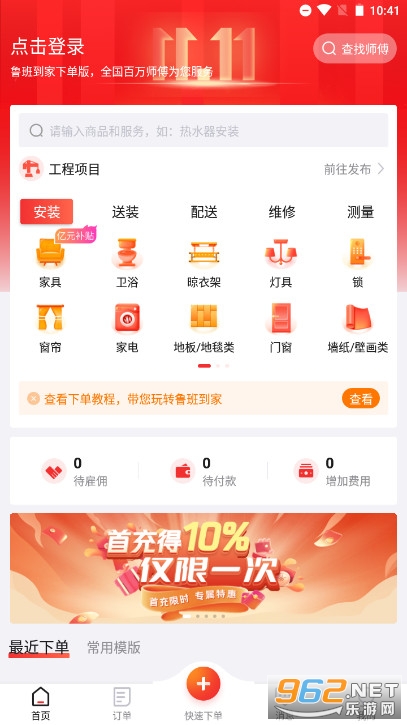 鲁班到家用户版是一款维修软件,如果你家里有什么电器换了,你可以在这里进行点击,随叫随到。分分钟解决电器坏了的问题,用户可以随时在这里进行鲁班到家师傅版是一款供家居安装师傅使用的鲁班接单app,师傅可以在这里进行注册,可以进行报价,可以查看最新的订单情况并及时进行接单和抢单感谢您的耐心等待。