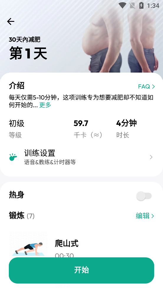 程序内提供有30多个动作,您可以有选择的创建自己的训练计划。如果您的膝盖或背部受伤,完全不必担心,更换不需要的运动即可。您还可以调整锻炼顺序和休息时间。为了达到最佳效果,建议您保持低热量饮食。