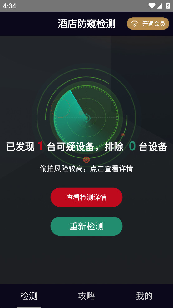 酒店防窥检测app是一款实用的隐私保护生活小工具,可帮助您实时扫描监控酒店房间隐藏的摄像头,防止个人被偷拍,导致个人隐私泄露。以实时发现可疑设备并剔除设备数据的形式展示检测进度。