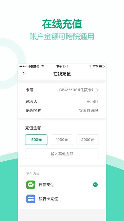 由安溪卫计局主导,为安溪居民提供线上挂号和缴费的便捷服务,支持多加门诊医院,可线上直接挂号,享受便捷就医。为群众提供移动支付,以及预交金充值、门诊住院费用结算、预约挂号、报告单查询、门诊住院费用明细查询、就医指南等一系列便民医疗服务。
