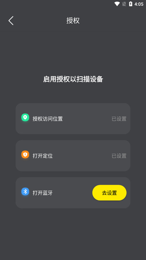 2、授权:启用授权以扫描设备,需要授权访问位置,打开定位,打开蓝牙,完成后即可成功连接。