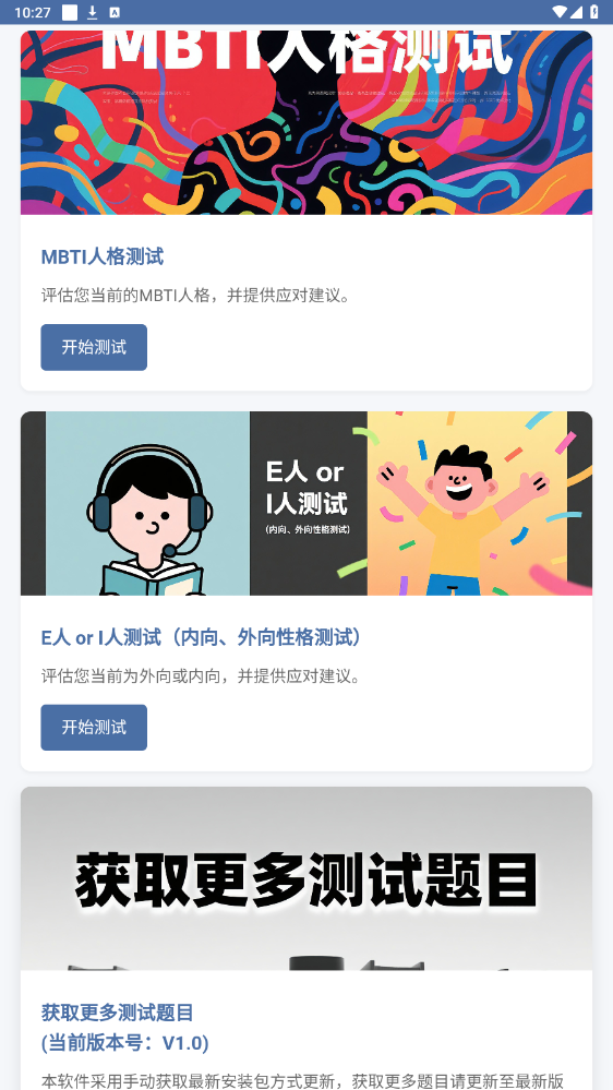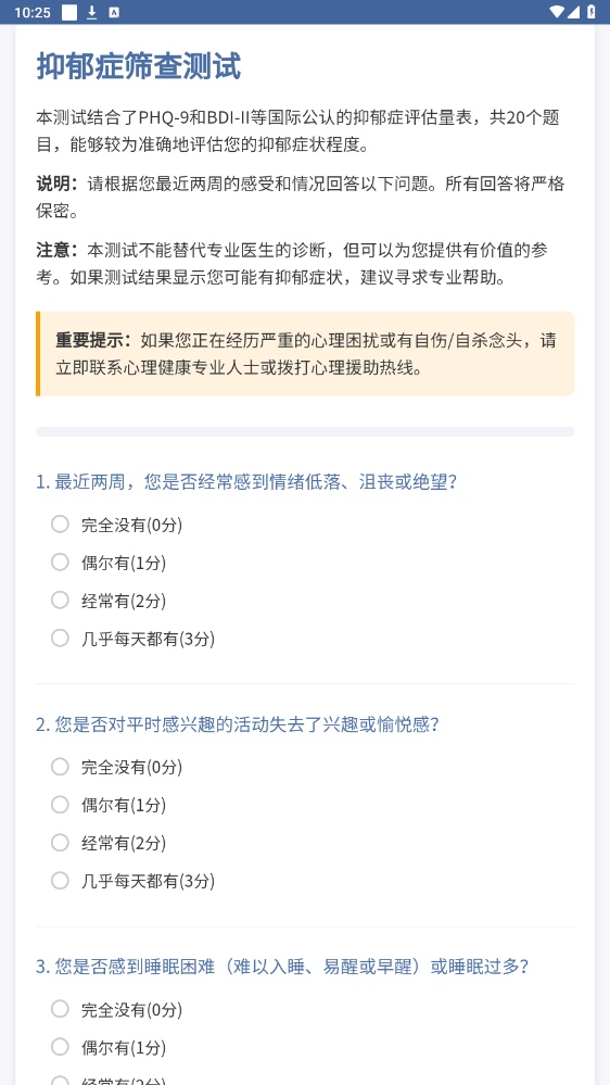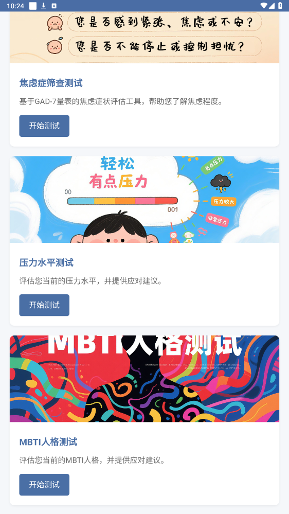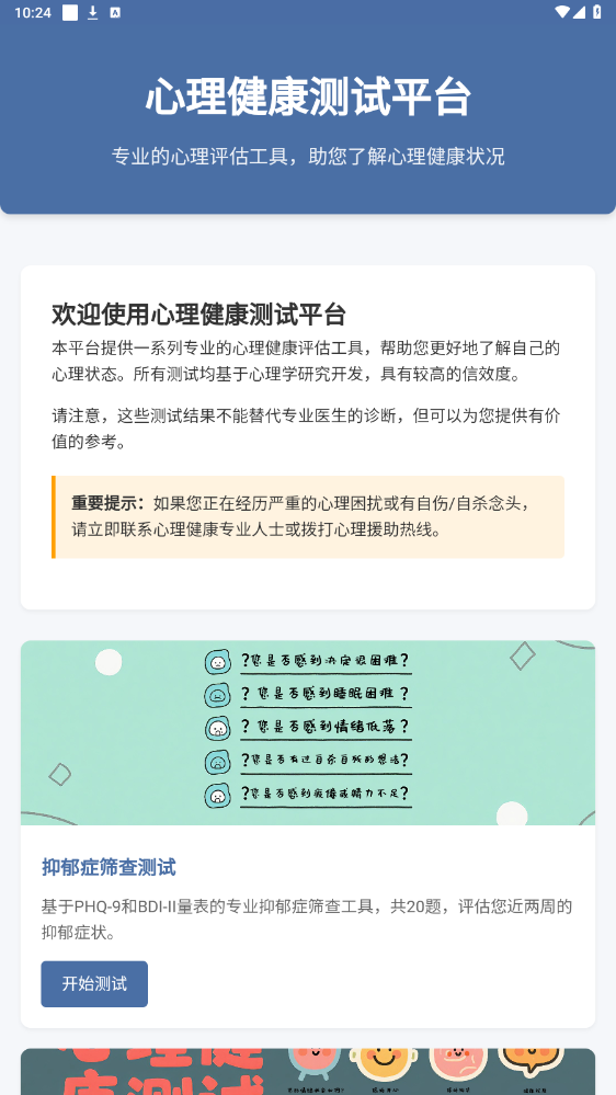 本软件是一款集专业心理自评与趣味心理探索于一体的工具型应用,旨在为大众提供免费,便捷的初步心理状态筛查工具。