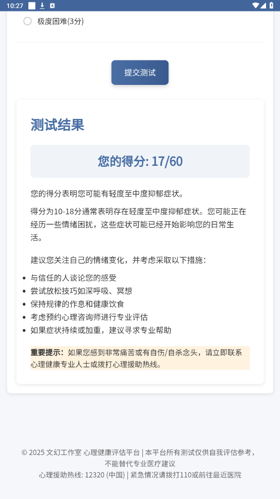 提供标准化抑郁、焦虑等测试,帮助用户初步评估自身心理状态,识别潜在风险并引导寻求专业帮助。