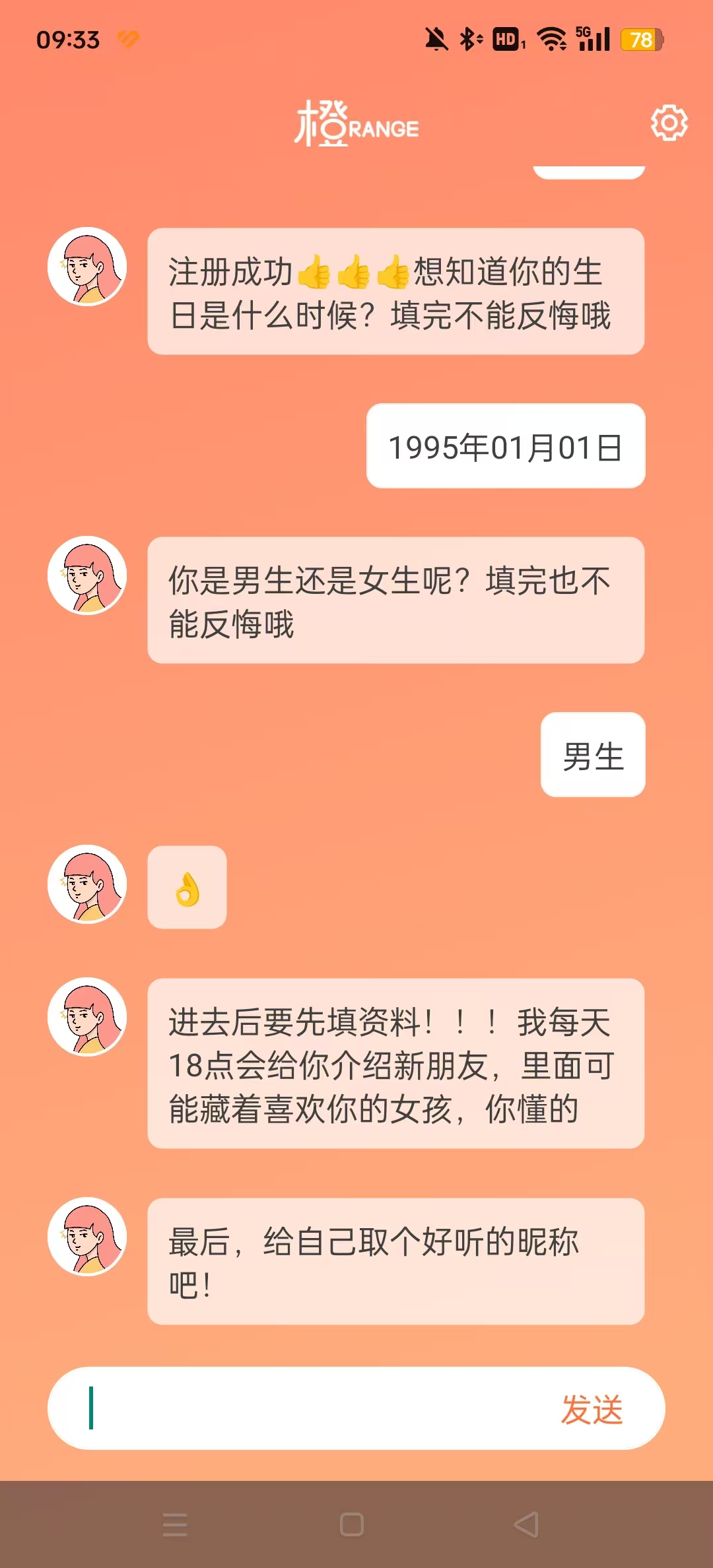 在用户首次使用时,橙采用了非常规的注册登录方式,将手机注册、验证码验证、简单的基本资料填写和应用玩法及其他说明都融合进了1对1的聊天对话里,对话内容使用日常用语配以emoji表情让用户第一感觉系统不再冷冰冰,软件整体采用橙白配色,传达出一种健康、积极的感觉。
