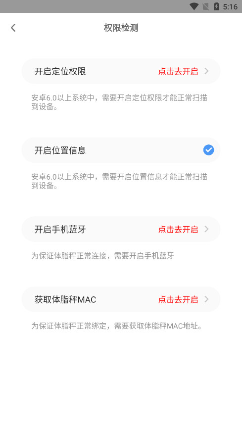 3、打开蓝牙,开启定位权限、开启位置信息、获取体重秤MAC,即可完成基本的okok体脂秤连接操作。