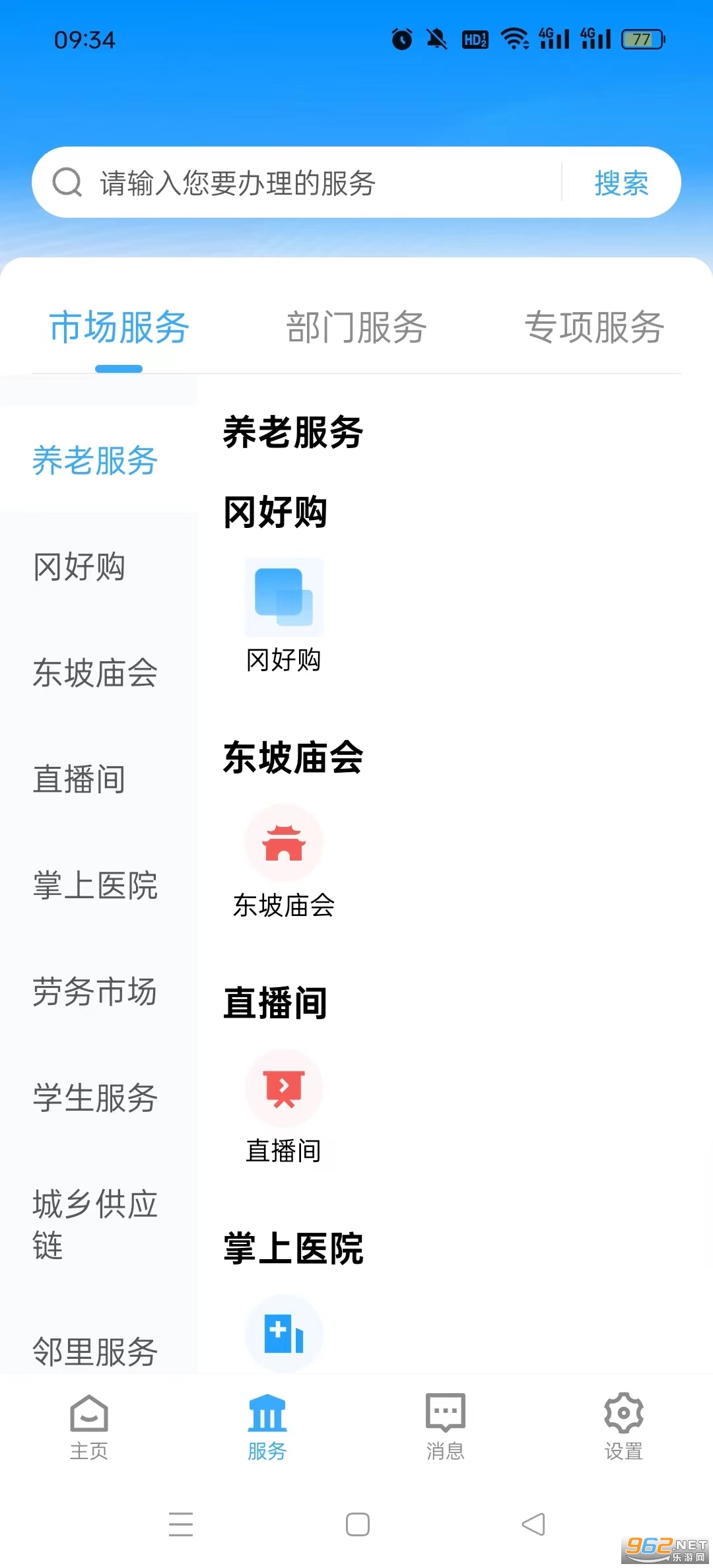 “市场服务”包含养老服务、冈好购、东坡庙会、直播间、掌上医院、劳务市场、学生服务、城乡供应链、邻里服务9个模块。