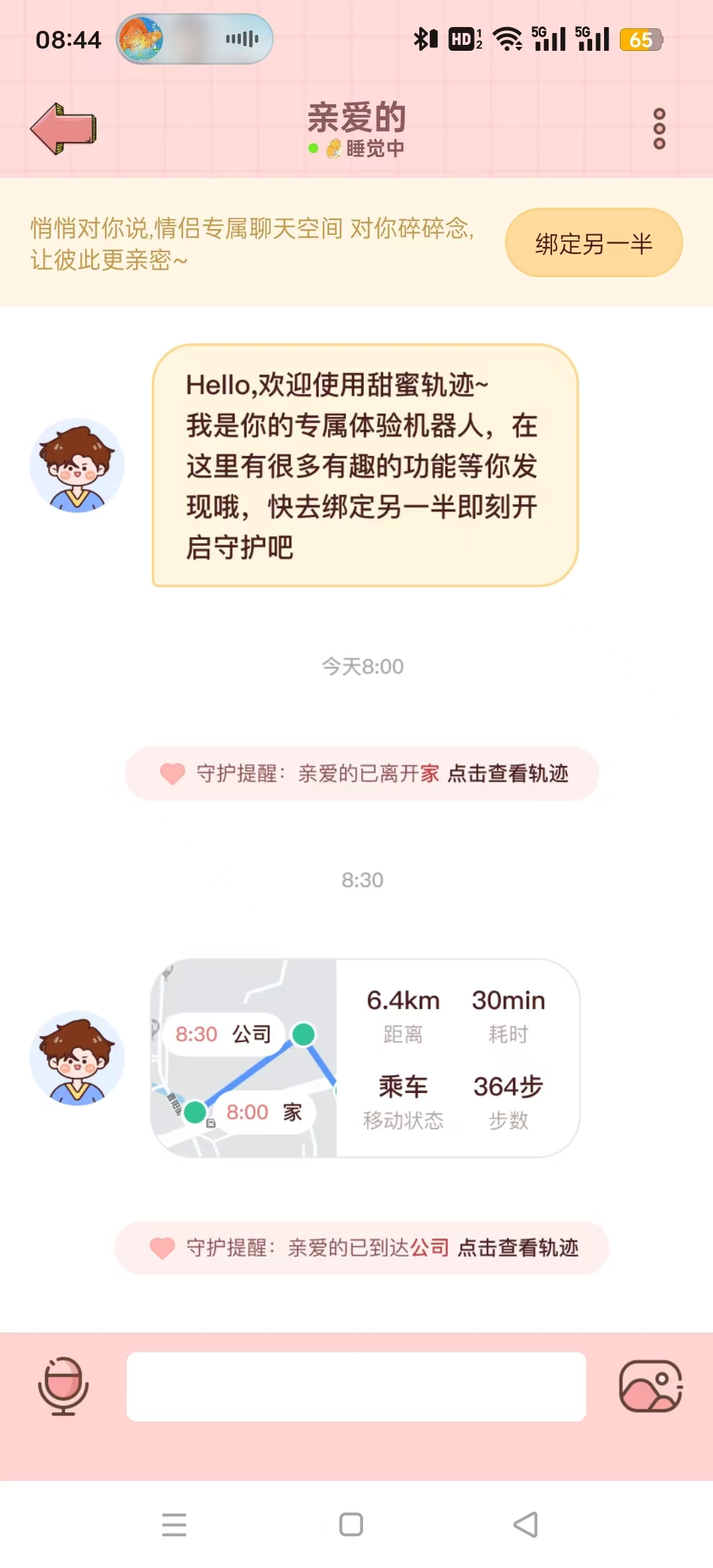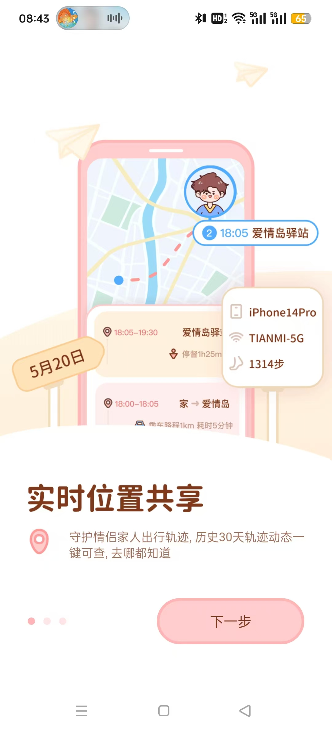 【时刻守护】实时查找伴侣位置,也可查看30天内足迹、停留时长和出行方式,保护伴侣安全,减少关心带来的负担。