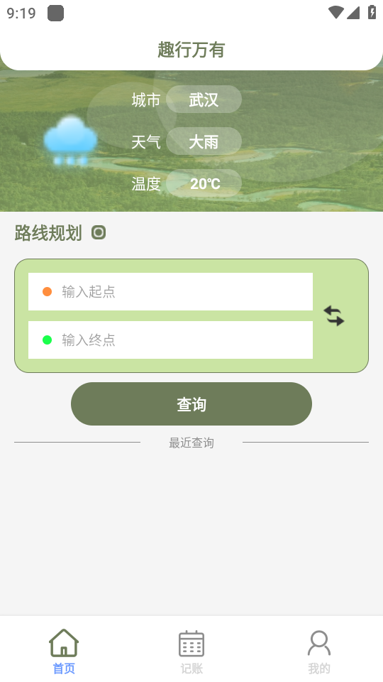 1、进入软件后,可以看到主要有线路规划和记账两大功能,填写起点和终点就能查询线路。