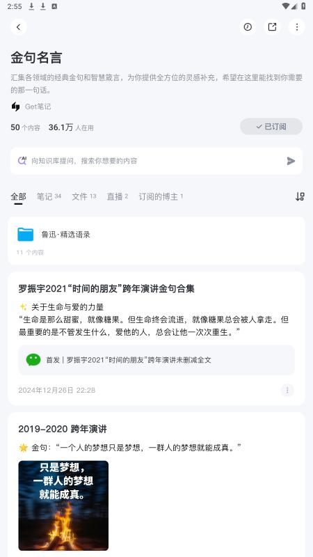 创建一个个人知识库,在知识库内,点击“添加内容”按钮,并选择“订阅直播/博主”