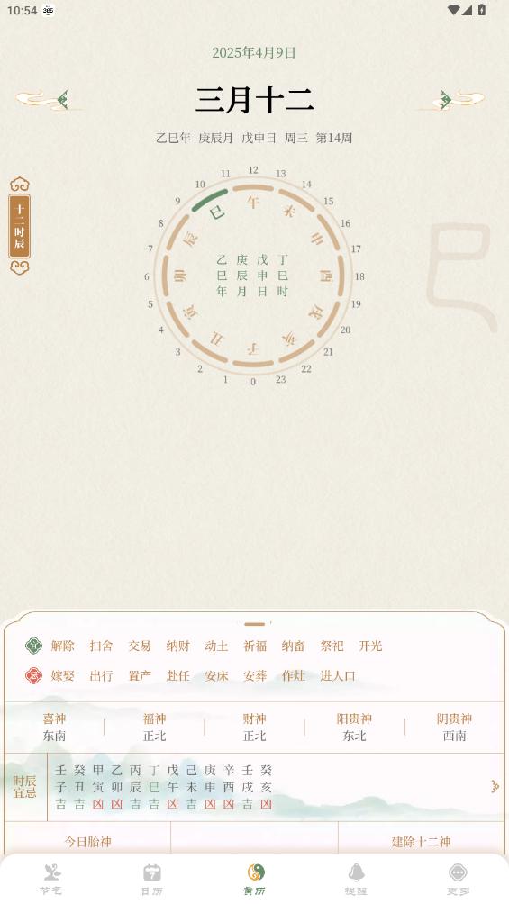 详细的十二时辰信息,可深入了解各个时辰的宜忌信息;