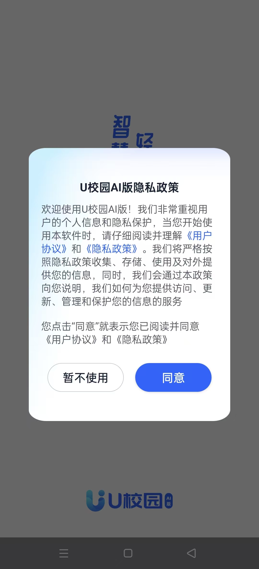 ●U校园AI版APP提供【密码登录】和【验证码登录】两种方式,首次登录请用【验证码登录】,未注册的手机号验证后将自动创建新账号。