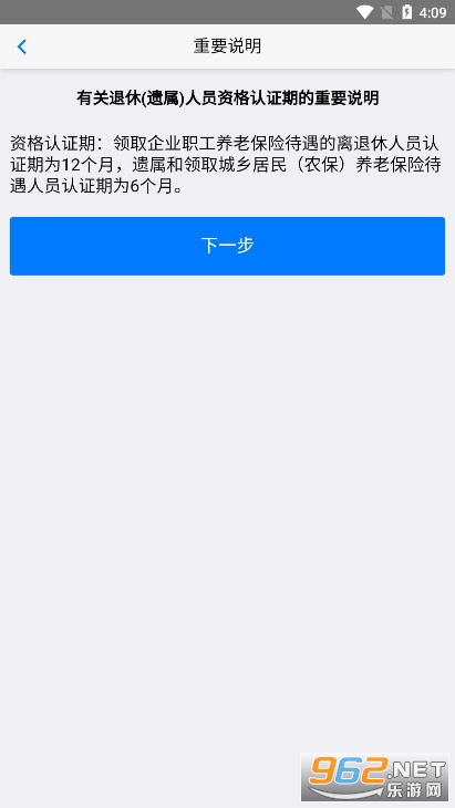 3、点击进入之后会有有关退休(遗属)人员资格认证期的重要说明资格认证期:领取企业职工养老保险待遇的离退休人员认证期为12个月,遗属和领取城乡居民(农保)养老保险待遇人员认证期为6个月。这里我们继续点击下一步