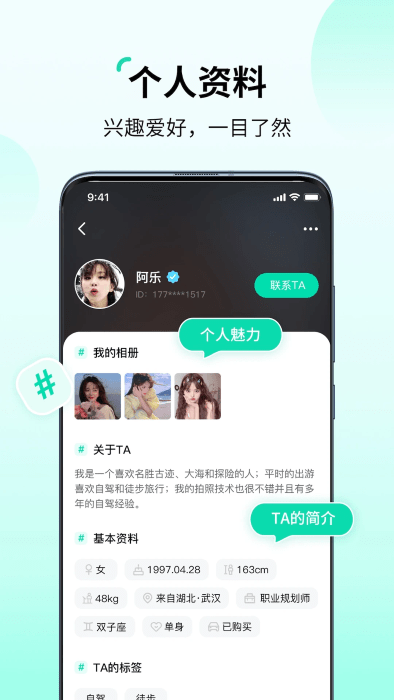 3、个人资料首页认证,兴趣爱好一目了然,让你随时随地发现身边智通达和的伙伴!