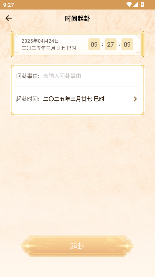 2、时间起卦是根据即时时间起卦,填写问卦事由即可,而数字起卦除了事由之外,还需要输入三组数字,随机起卦就是随机的,没有时间和数字选项,直接问卦即可。