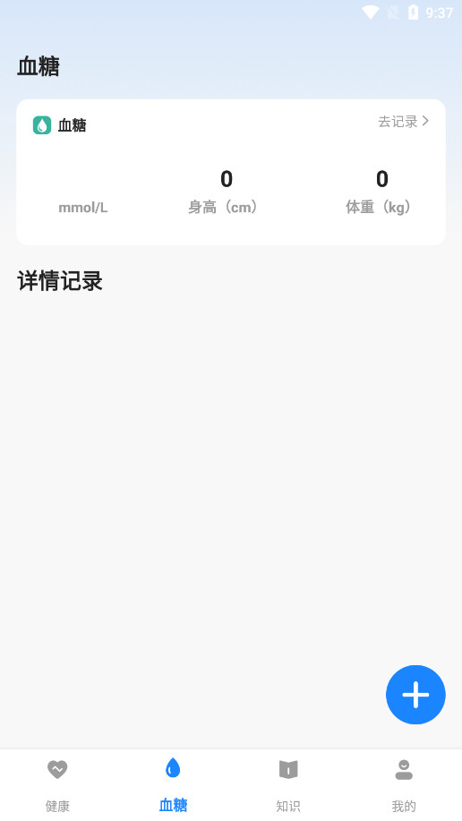 2、【血糖】版块中,主要针对个人血糖健康情况做一个详细的记录,点选右下方的蓝色+号上传数据。