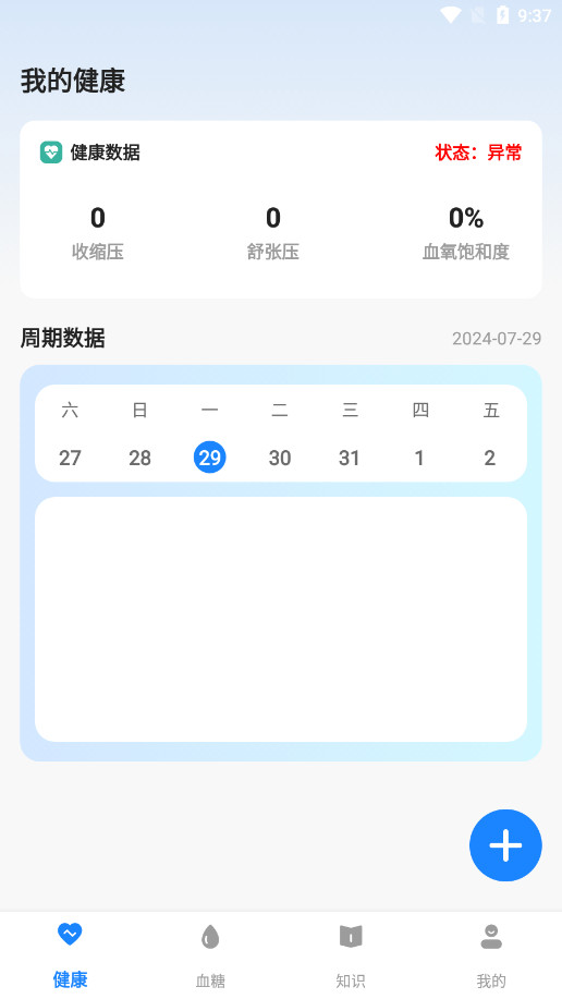 1、打开软件进入,首先在【健康】版块,有很清晰的展示你个人的健康数据情况,包括收缩压、舒张压还有血糖样饱和等;针对周期数据的具体时间也有详细的说明记录。