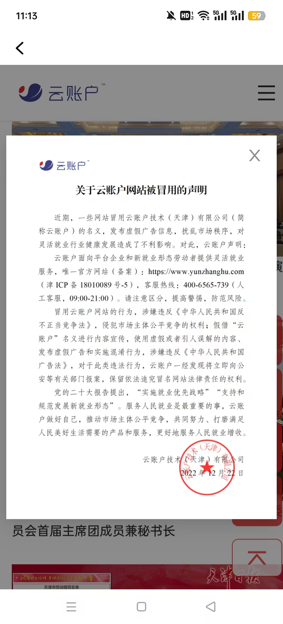 云账户坚持依法合规经营,为新就业形态劳动者提供合规风控审核、工商税务代办、业务总包分包、收入核验结算、商业保险保障等灵活就业服务。云账户从未与任何主体合作或授权任何网站、App,开展任何形式的收费业务,比如预先缴纳保证金后的搜索App点赞有奖、积分兑换、刷单返利、购物服务等,今后也不会在灵活就业服务以外,跟任何主体合作投资理财、网络贷款、网络游戏产品交易等业务。云账户提醒广大劳动者,不法分子虚构事实或隐瞒真相,利用电信网络平台非接触性骗取财物,具有很强的隐蔽性和传播性。您尤其需要警惕线上做任务领红包、冒充电商物流客服等新型骗局,不轻信陌生网站或链接,不随意提供个人隐私信息或进行资金交易。请认准云账户的唯一官方网站(https://www.yunzhanghu.com),增强安全防范意识,保护自身财产安全。云账户已与公安机关建立汇报机制,将积极主动发现、举报诈骗网站,配合公安机关打击不法分子的违法犯罪行为,帮助劳动者避免受骗。如遇疑似诈骗,您可第一时间拨打云账户客服热线400 6565 739(09:00-21:00)核实,或登录云账户官方网站预约咨询,避免遭受财产损失。云账户与您共同营造清朗网络空间,维护新业态健康发展生态。