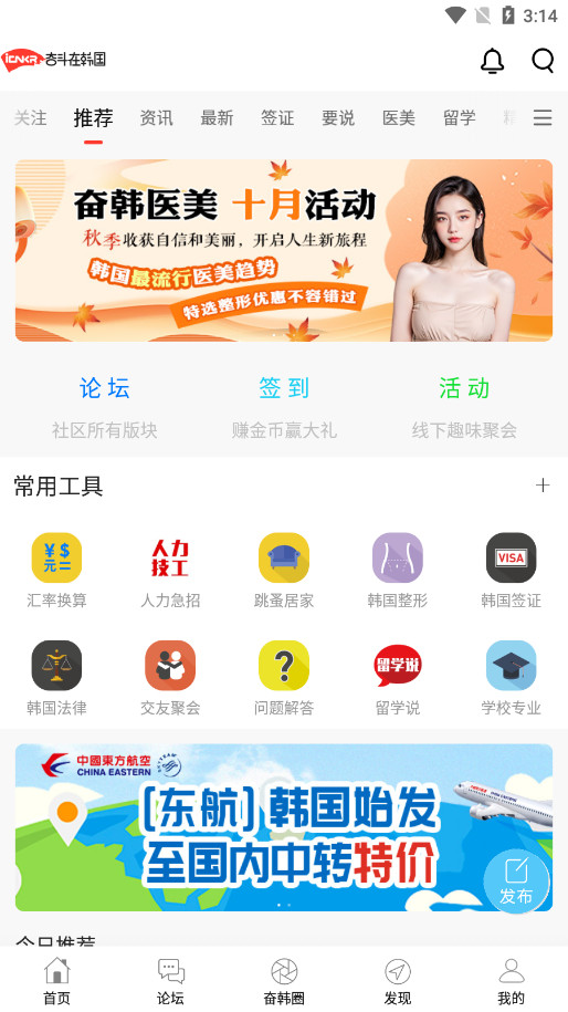 奋斗在韩国APP,作为网站的移动端延伸,日活跃四万用户,为在韩华人提供了一个更加便捷、实时的信息交流平台。用户可以通过APP查看韩国当地的天气、货币汇率等实用信息,随时关注国内外的最新动态,掌握第一手消息。无论是生活琐事还是专业咨询,都能在这里找到答案。