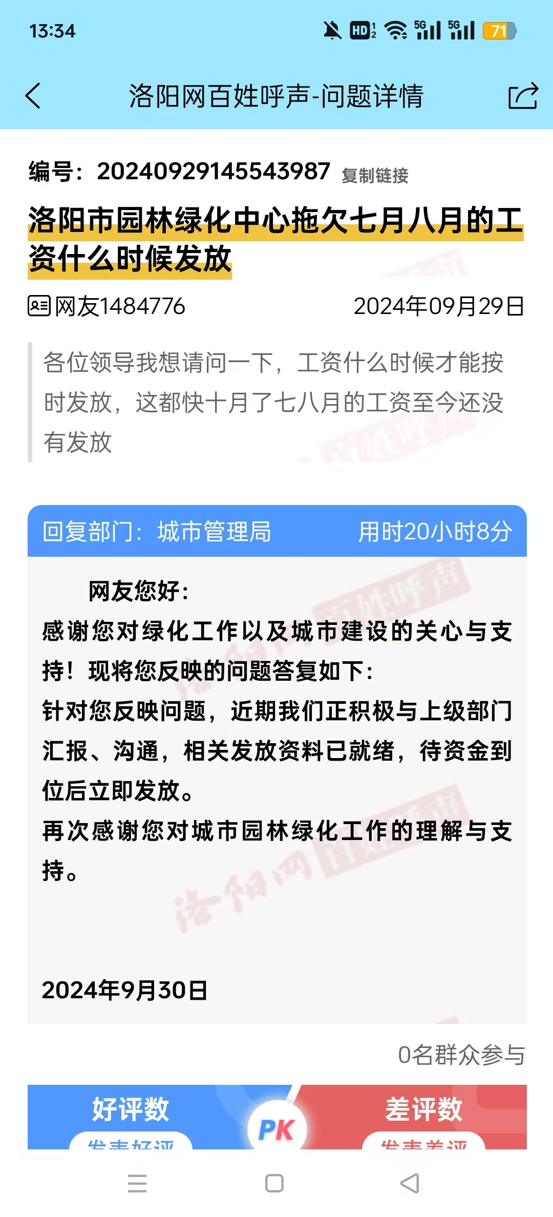 提醒:百姓呼声是洛阳市职能部门通过洛阳网网络平台解决市民难事、烦事的一条渠道。该平台致力于化解矛盾解决问题,但并不保证一切问题都得到解决和答复;由于许多问题具有复杂性和多面性,它们的最终解决还需要通过其他渠道进行。为维护大多数网民的利益,请合理使用该平台。