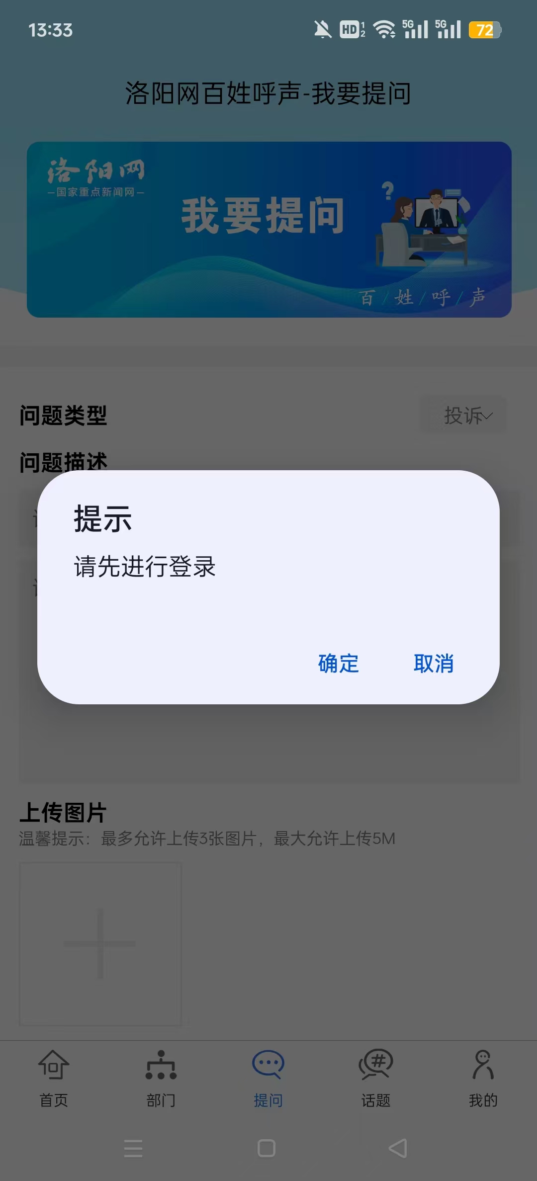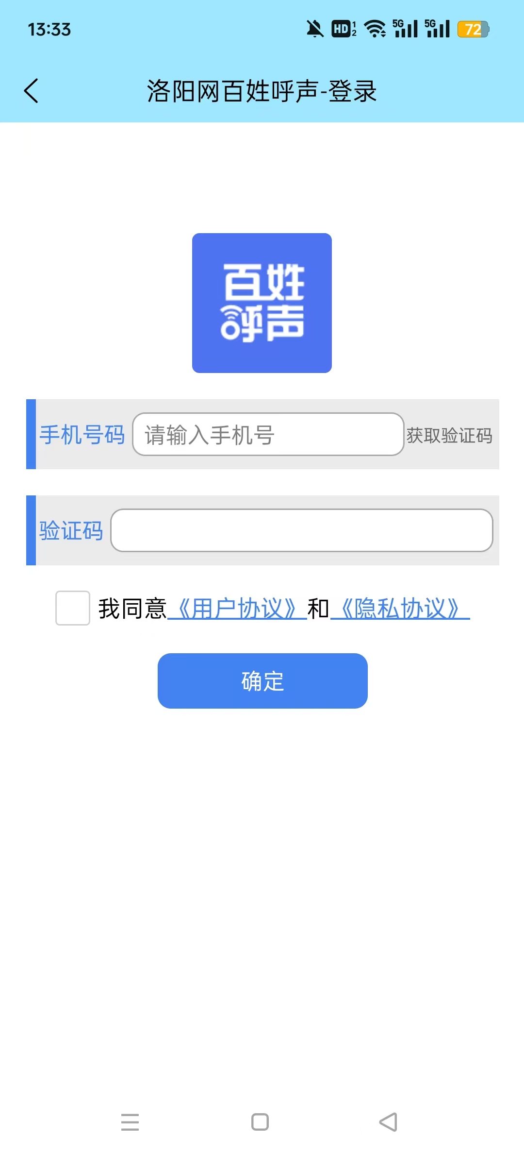 1、打开下载安装的百姓呼声官方版洛阳网安卓最新版应用,按照提示先进行登录。