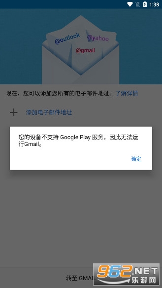 2、打开Gmail APP,点击“登录”按钮,选择添加电子邮件地址,如果有提示“您的设备不支持Google Play服务,因此无法运行Gmail”,则是需要使用加速器启动进入