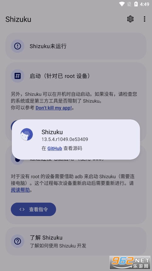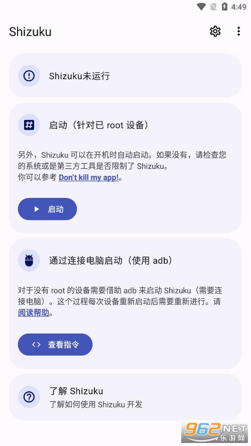接下来咱们打开Shizuku这款软件,根据App提供的教程步骤激活Shizuku即可。