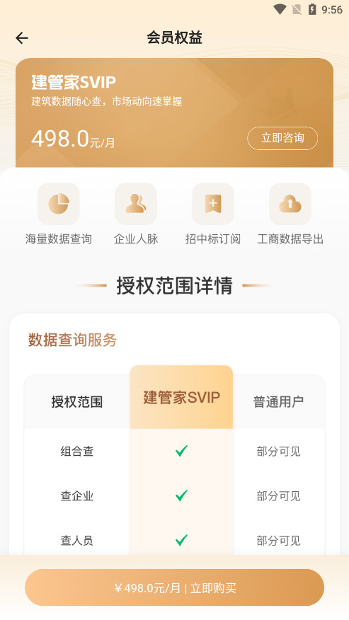 大数据服务:建管家大数据服务是建管家的核心业务之一,坚持提供“快、全、准、智”的大数据服务,通过数据挖掘、智能算法、数据应用等为建筑企业提供更为全面的数据服务。建管家大数据服务平台秉承多元化的服务理念,升级推出“1平台5产品”的五角星型服务体系,即1个综合大数据服务平台,5款业务应用产品,助力企业通过智能化工具快速开拓市场,推动企业加速实现数字化高质量发展。