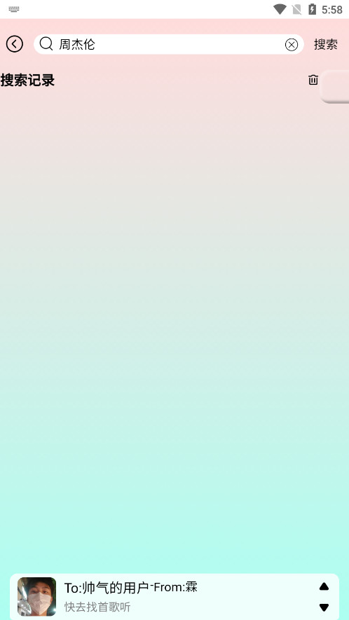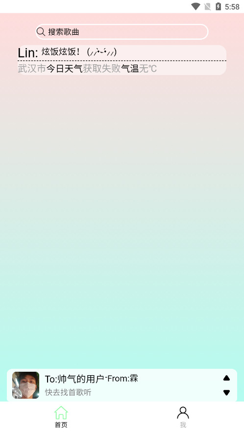 1、yulinlin音乐页面展示部分极为简单,分为【首页】、【我的】两部分,这里我们需要点击上方的搜索歌曲查看播放源。