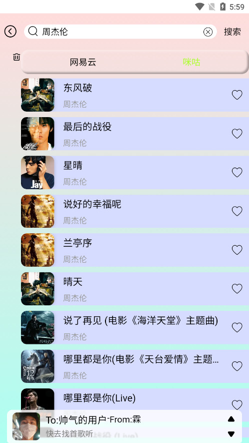 3、例如小编在这里输入“周杰伦”点选搜索后,就会匹配出网易云音乐和咪咕音乐平台的播放资源。