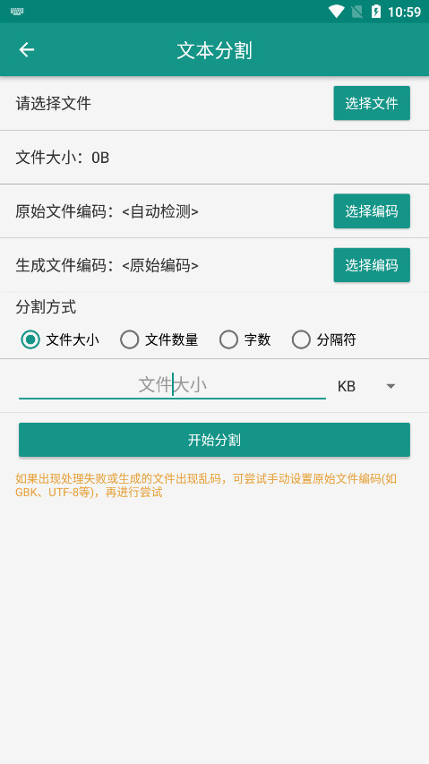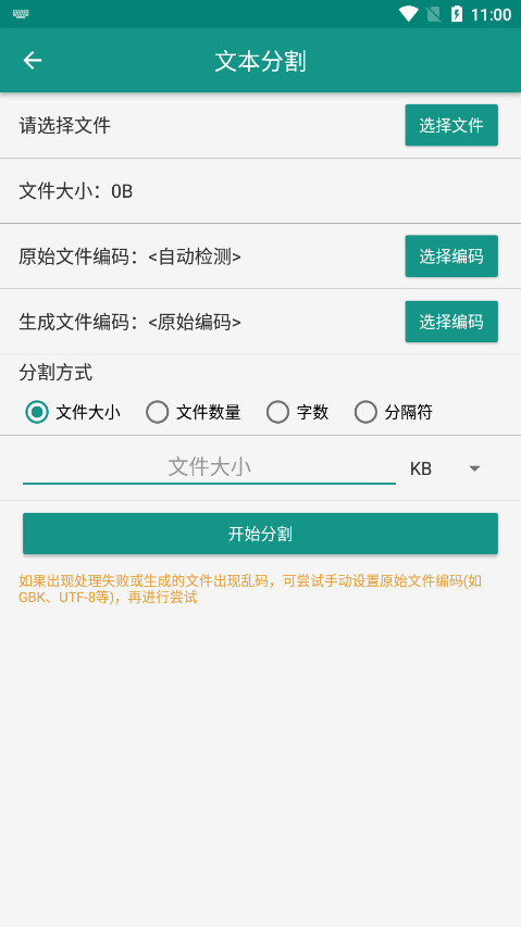 文本分割:文本分割功能有4种分割方式,可以按照分割后的文件大小分割Txt文件、按照分割后的txt文件个数分割、按照每个txt文件的字符数分割、按照分隔符分割txt文件。