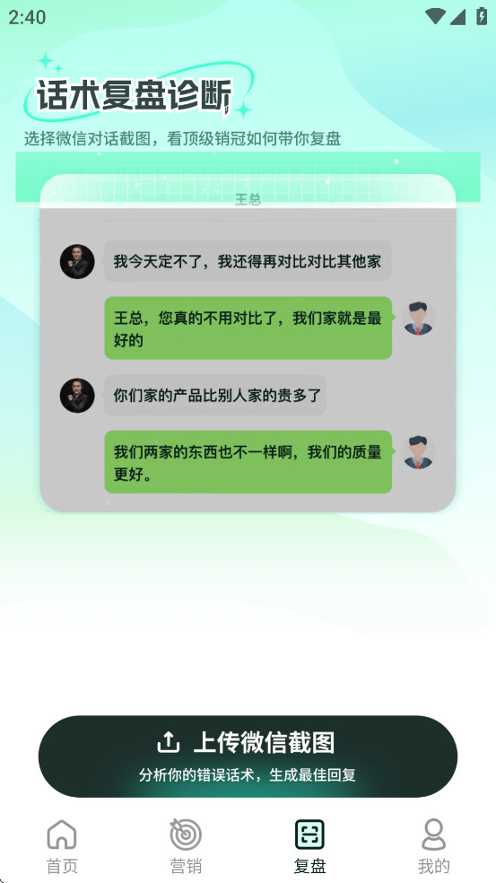 复盘功能:除了智能回复外,成交输入法还提供了复盘功能。通过扫描聊天截图或手动输入对话内容,软件会自动解析对话内容,帮助销售人员发现并改进错误的话术。这一功能特别适合销售小白,可以帮助他们总结经验教训,提升销售技巧。