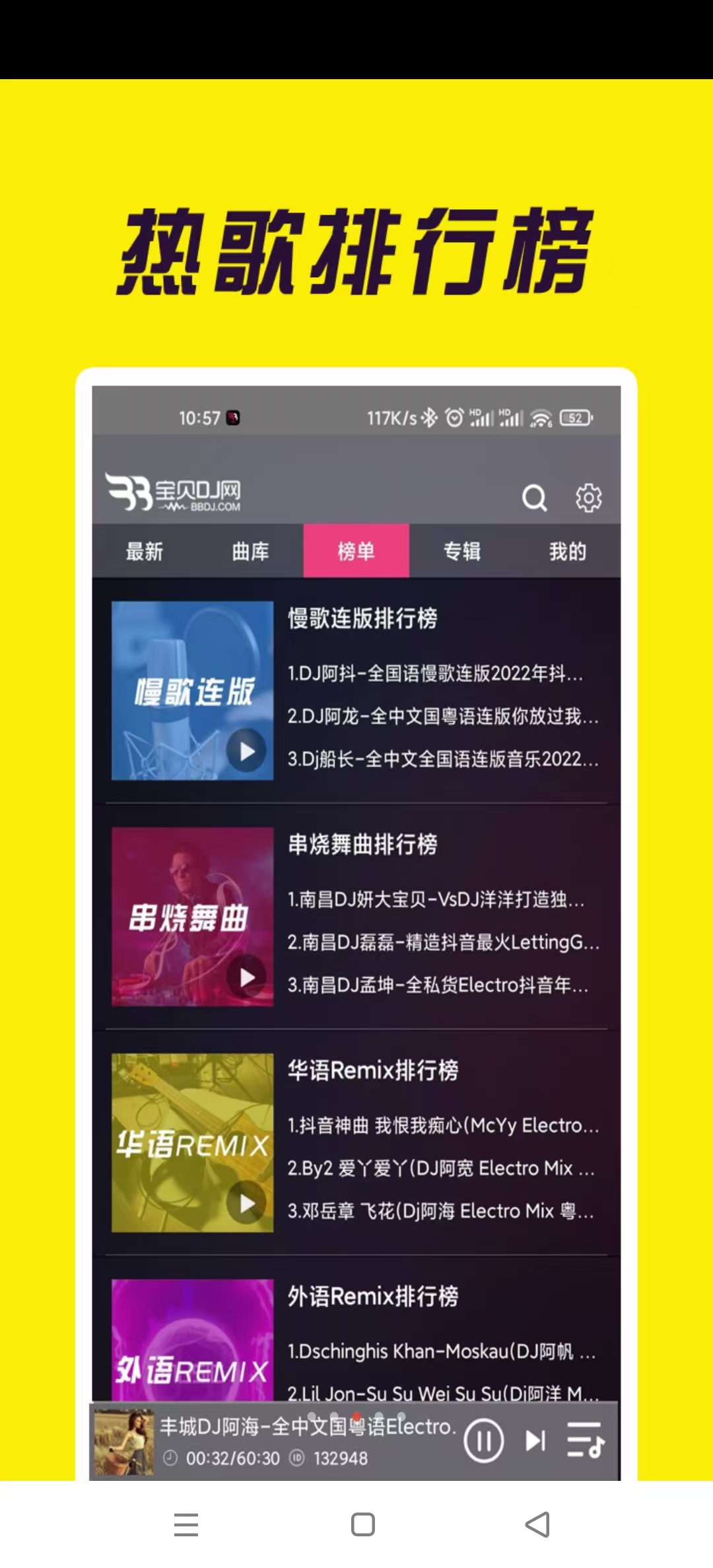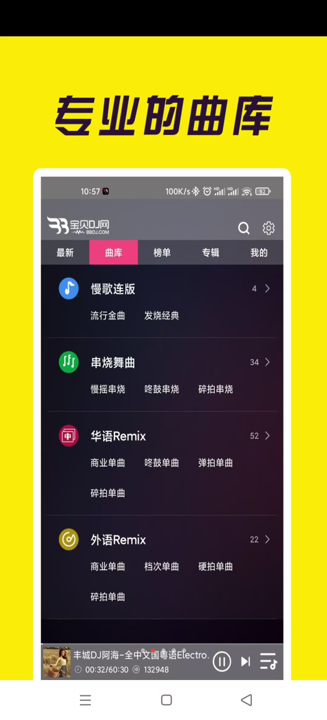 中文DJ舞曲、英文DJ舞曲、3D环绕舞曲,日韩舞曲、车载、夜店、喊麦、电音DJ、节奏、Remix、网络DJ、网络红歌、经典老歌、伤感歌曲、铃声DJ、无损专区,只有想不到,没有找不到。