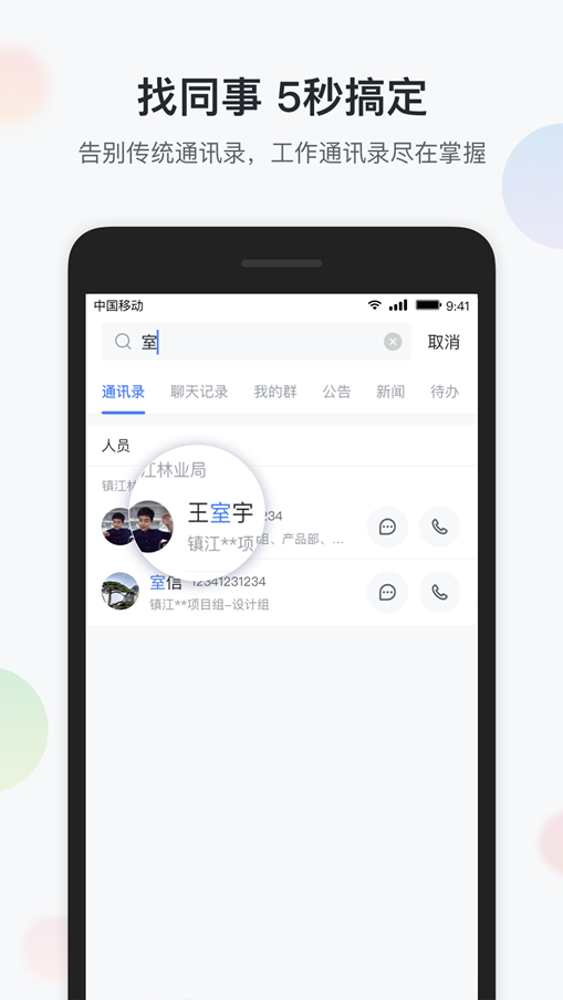 2,公文流转:以内部通讯号码为轴线,免去记忆账户和密码的繁琐,更加方便对于文件的灵活传阅和签批,尤其适用于人事变动频繁、分工灵活的政府单位。