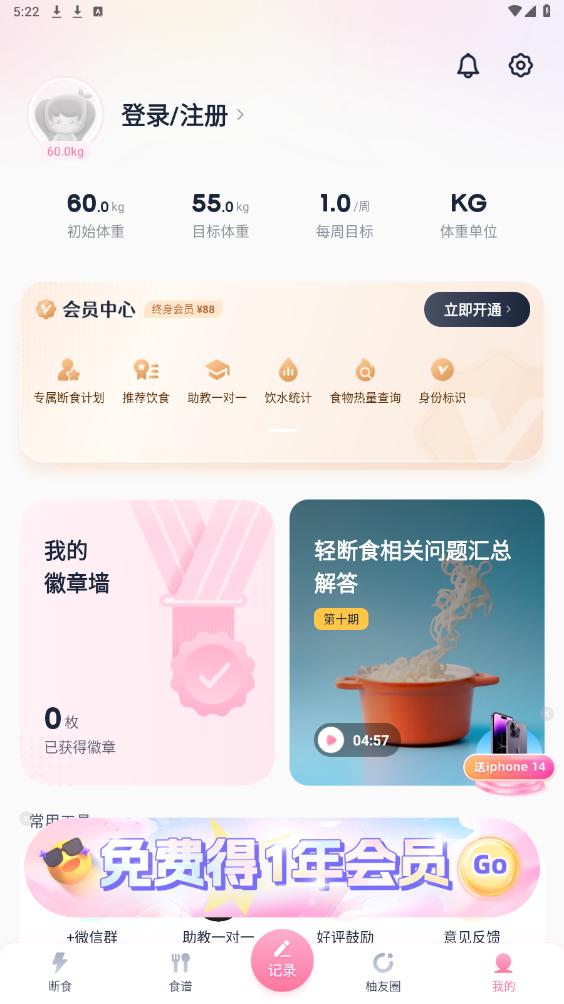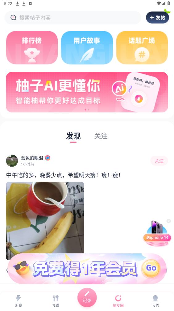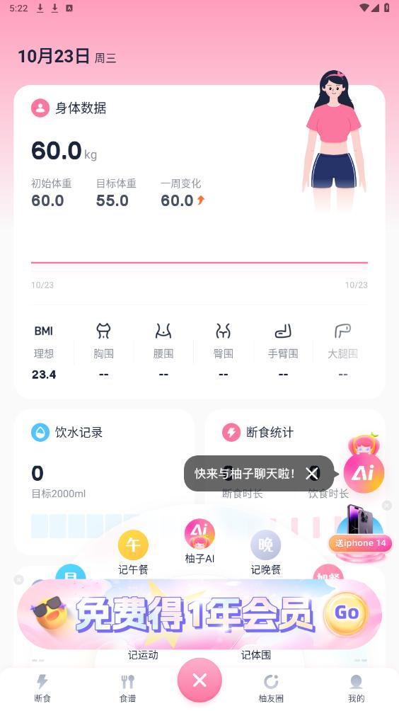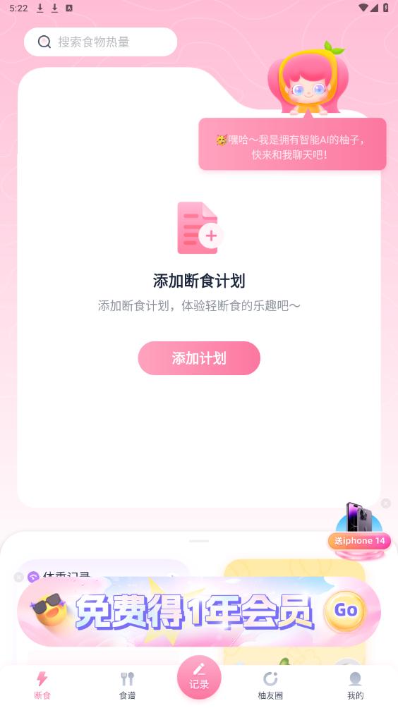 《柚子轻断食app》是一款专注于健康减肥和饮食管理的应用程序,它通过科学的轻断食计划和个性化的饮食建议,帮助用户实现健康减脂和理想体重。这款软件结合了创新的AI助手功能,能够智能分析食物热量和营养成分,为用户提供详细的营养报告和个性化的饮食计划。