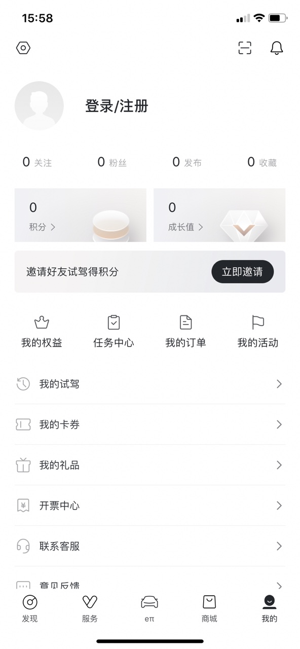 登录成功后进入 APP 首页,如图所示,未绑定车辆且无他人授权车辆时无法使用远程控制及车况中心等功能。