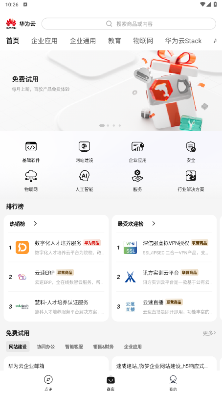提供SaaS、License、硬件、镜像、人工服务、API、容器、资产、应用安排等交付方式的商品,涵盖基础软件、网站建设、企业应用、安全、物联网、人工智能、服务、行业解决方案等大类,满足用户多元化的云接入需求。