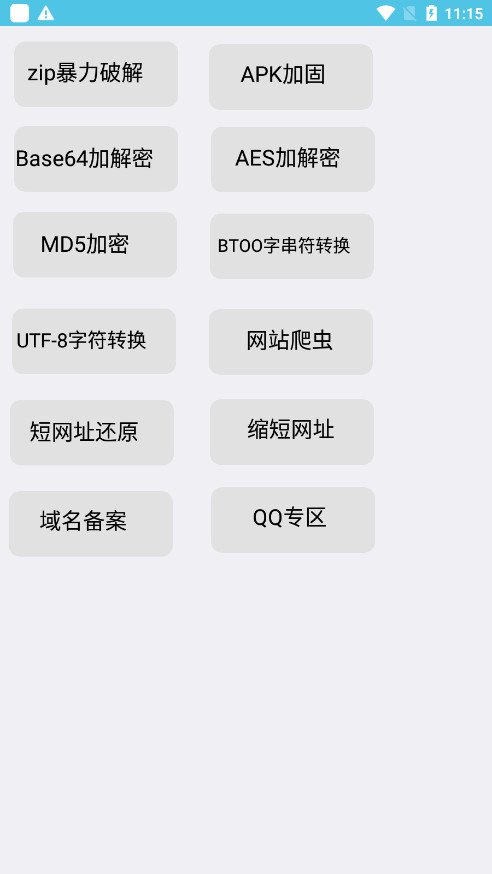 1、Z工具箱app基本功能有:zip暴力破解、base64加解密、MD5加密、UTF-8字符转换、短网址还原、域名备案、APK加固、AES加解密、BT00字串符转换、网站爬虫、缩短网址以及QQ专区。