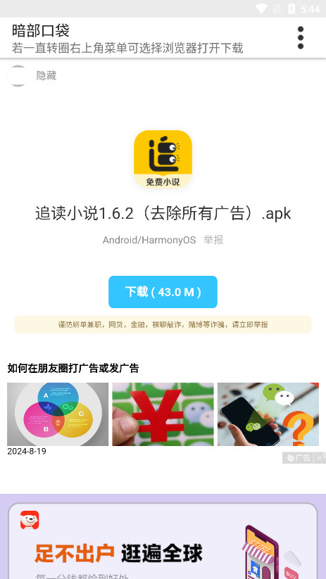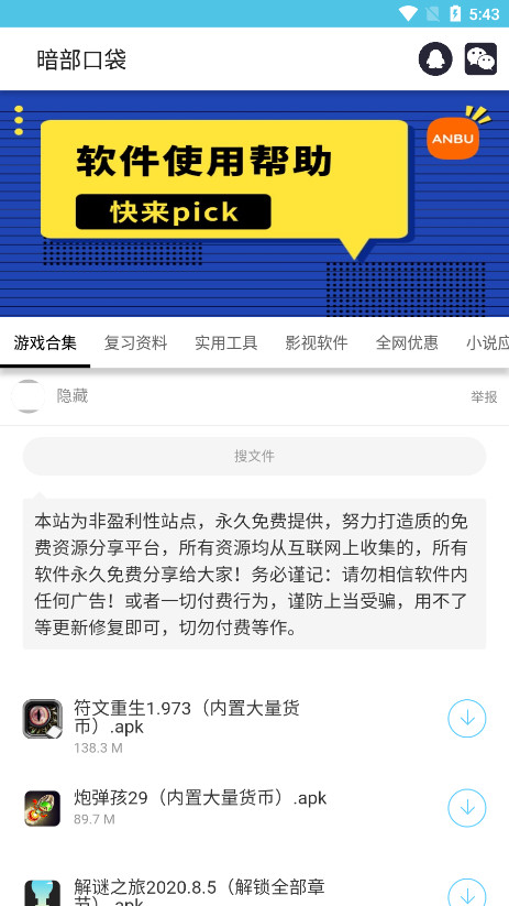 《暗部口袋》是一个非常好用的宅福利软件库蓝奏云合集网站软件,这里有很多免费分享的各种福利软件,都是平常找不到的,你在这里可以免费下载,长期关注长期更新。我们点击任意软件,可以看到相关软件的介绍以及下载界面。点击下载可以直接通过软件仓库进行下载,也可以点击浏览器打开该蓝奏云的下载链接进行下载。