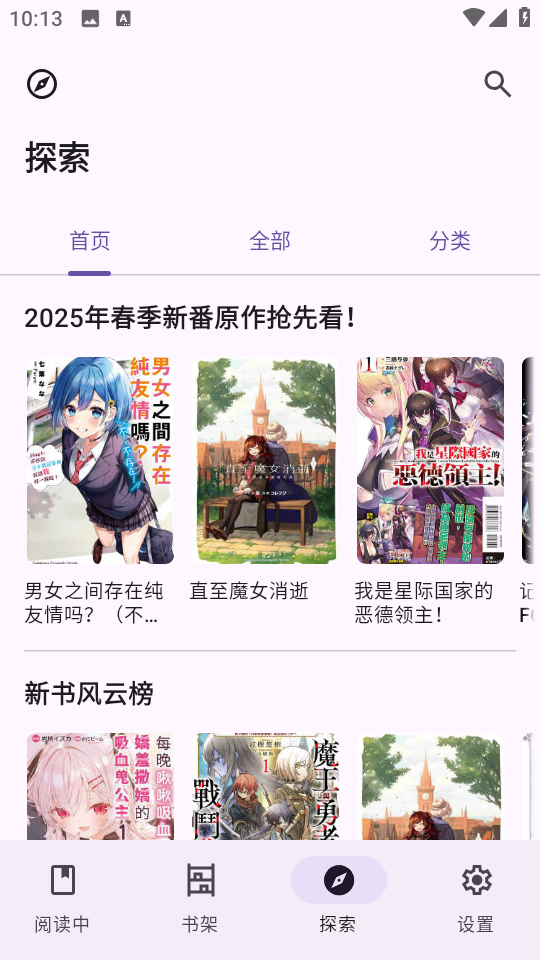 2、在探索界面可以看到推荐的小说,也可以在分类里面找到喜欢的小说类型。