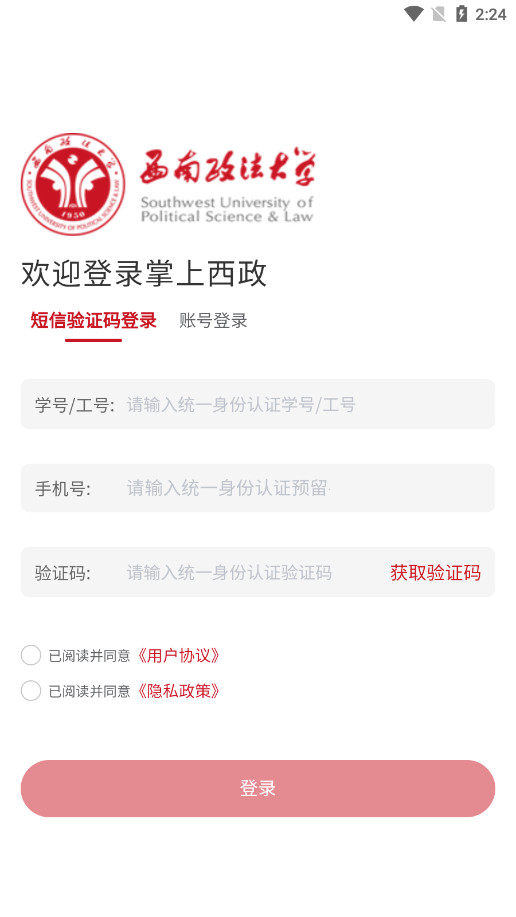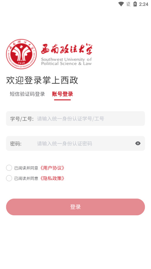 “掌上西政”APP账号无需申请,可使用学校统一身份认证账号进行手机短信认证登录或使用账号密码登录。