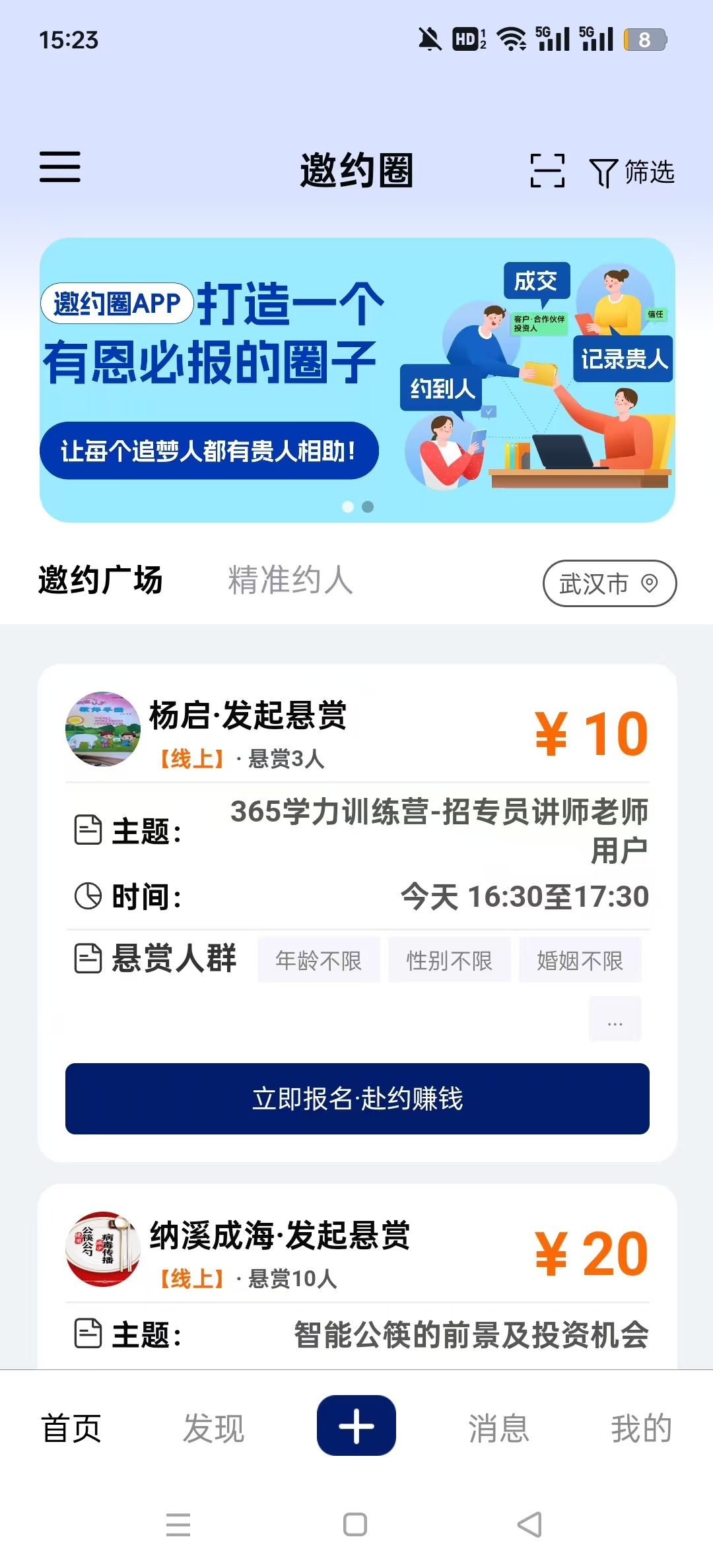 约人就用邀约圈——悬赏邀约赴约赚钱,专注于商务人士邀约需求的信息服务平台。邀约圈软件结合线上课程和线下社群陪伴,帮助用户实现个人成长和心灵健康。