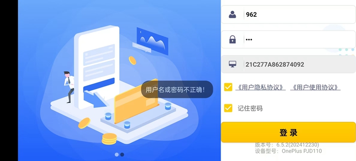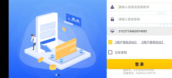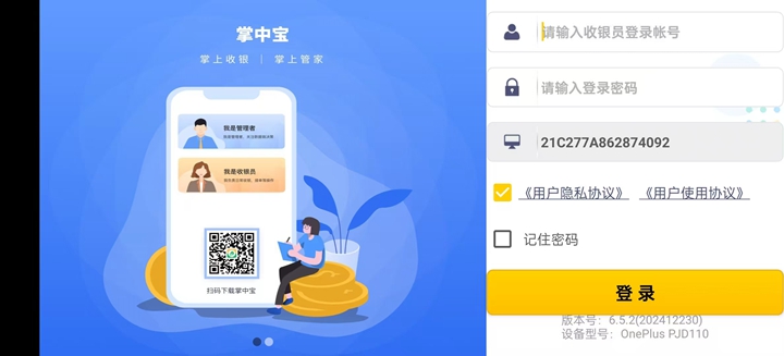 3、输入富掌柜智能版收银员登录账号和登录密码,勾选下方的用户协议、用户使用协议,为了方便下次登录点选记住密码保存设置,完成登录。