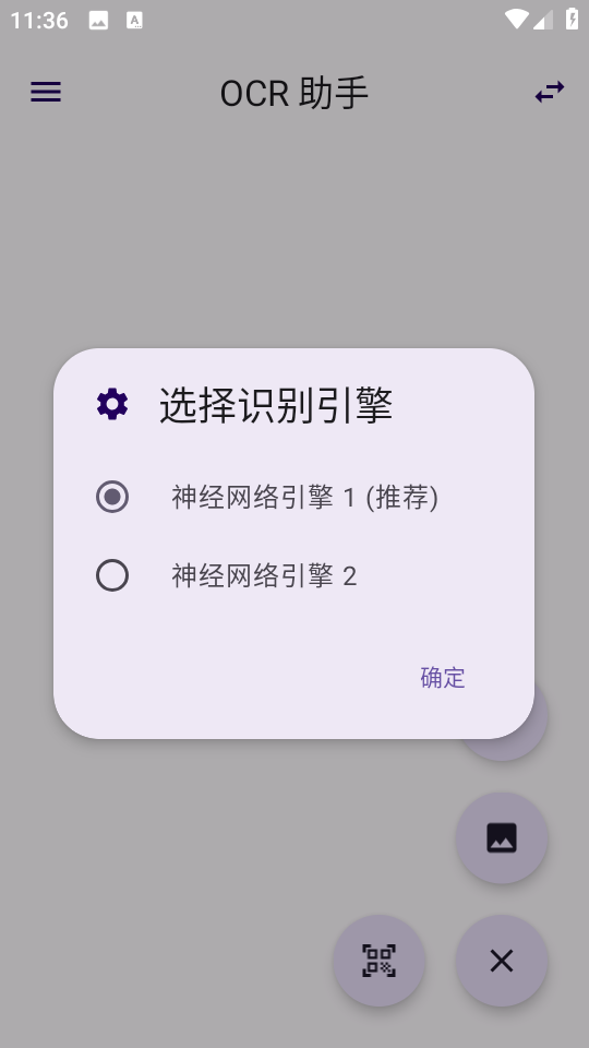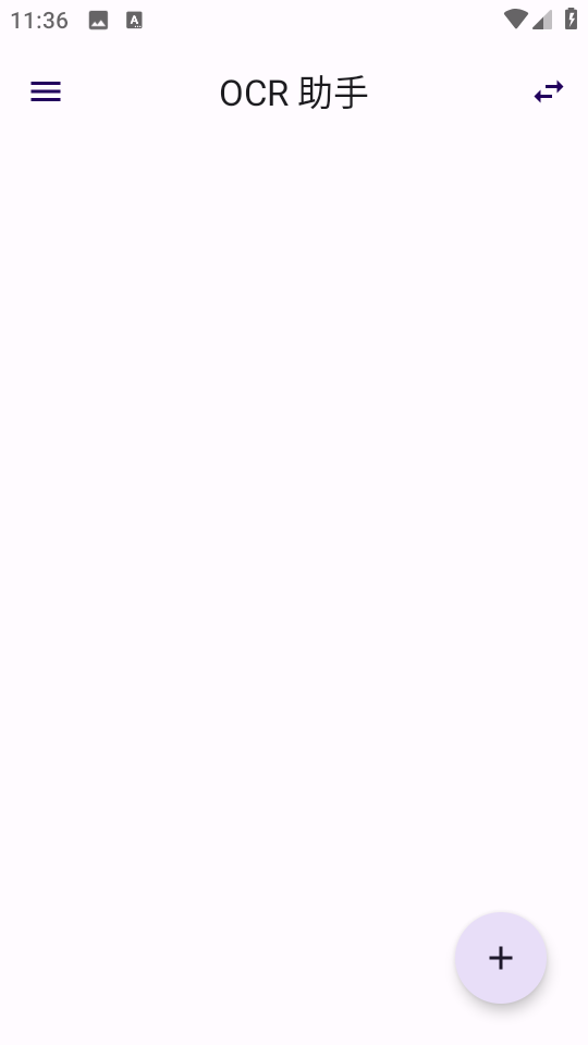 1、进入软件后,可以看到界面非常简洁,点击右上角可以切换识别引擎,右下角+号键可以开启识别