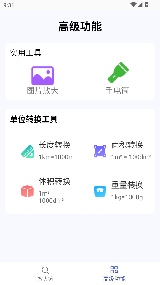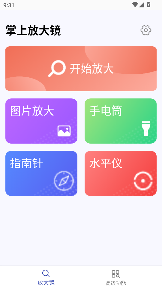 1、进软件后,在个人中心页面中可以看到有图片放大、手电筒、指南针、水平仪等功能