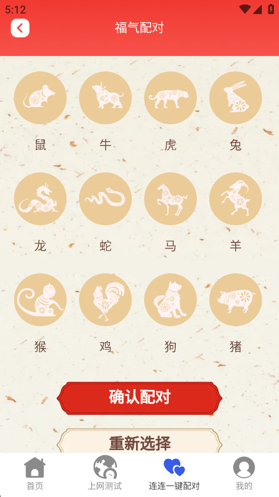 点击选择男女生生肖,点击【确认配对】,需要注意第一次点击是男生生肖第二次点击是女生生肖,想要重新选择就点击【重新选择】