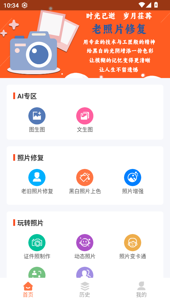 《自助老照片修复》是一款功能全面的安卓应用,集成AI修复、证件照生成及智能作图三大核心模块。支持老照片修复、黑白上色、清晰度增强,可一键生成任意规格证件照,并可通过关键词创作个性化图片。界面友好易操作,让旧照焕新、回忆重现变得简单高效,是影像处理爱好者的实用工具。