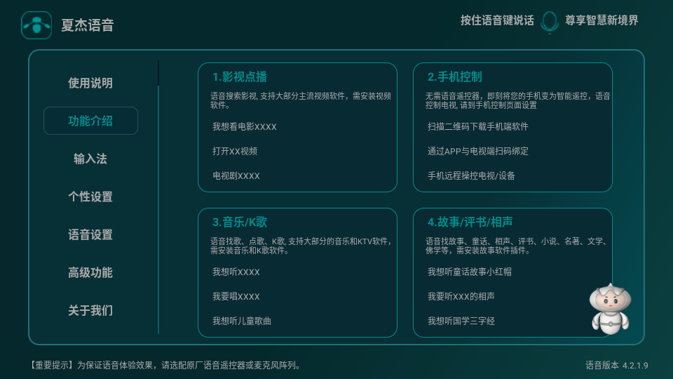独创语音+体感+遥控的三模交互,支持复杂指令的复合输入(如"用粤语搜索周星驰的电影,按年份排序")。不同交互方式的优先级智能切换,确保操控流畅性。