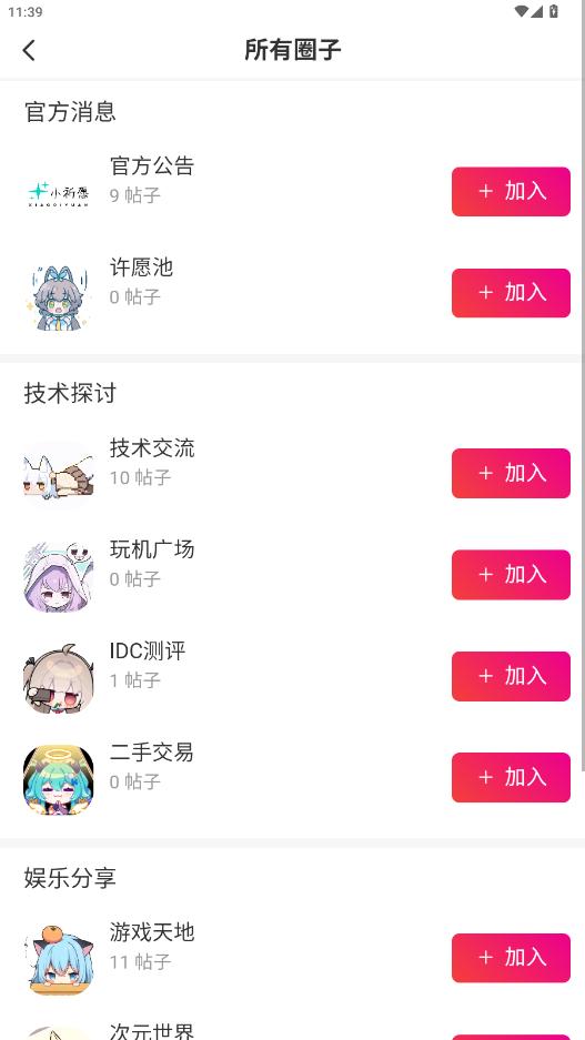 点击进入圈子界面,可以加入自己感兴趣的圈子,和其他的用户交流互动