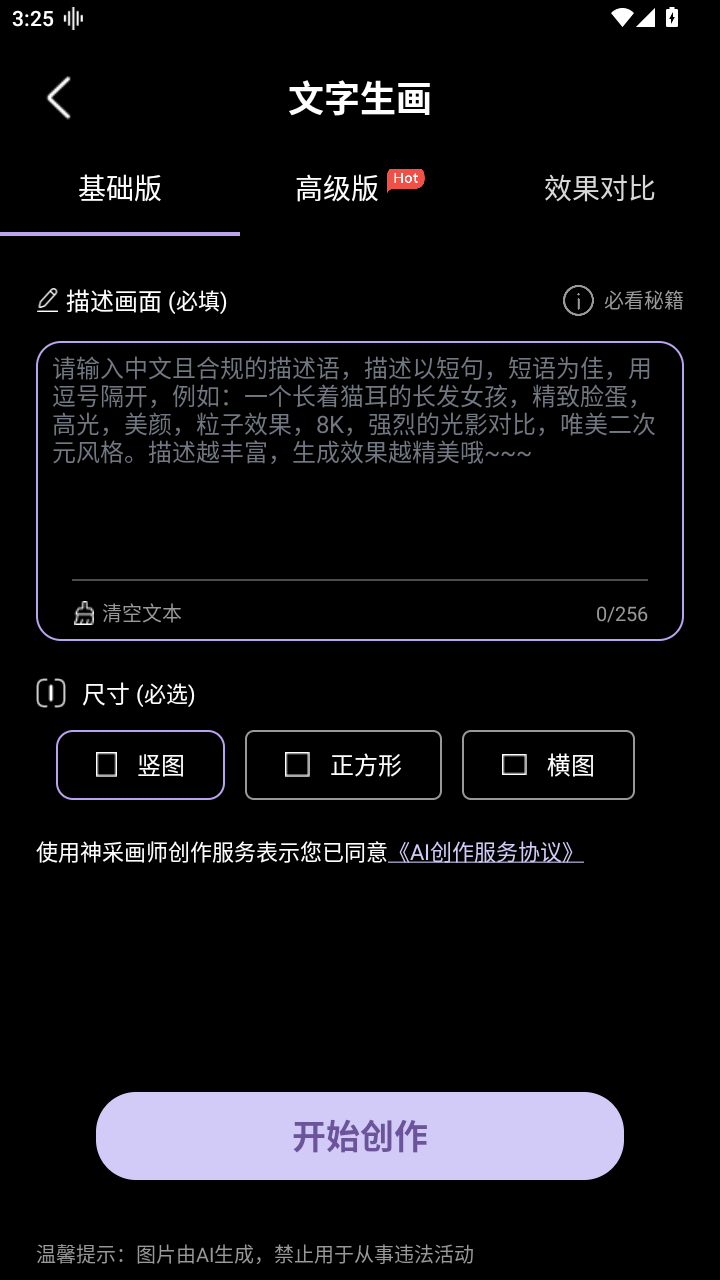 2、这里里文字生画为例,进入文字生画界面后,在编辑框里面填入画面描述文字,然后点击开始创作。