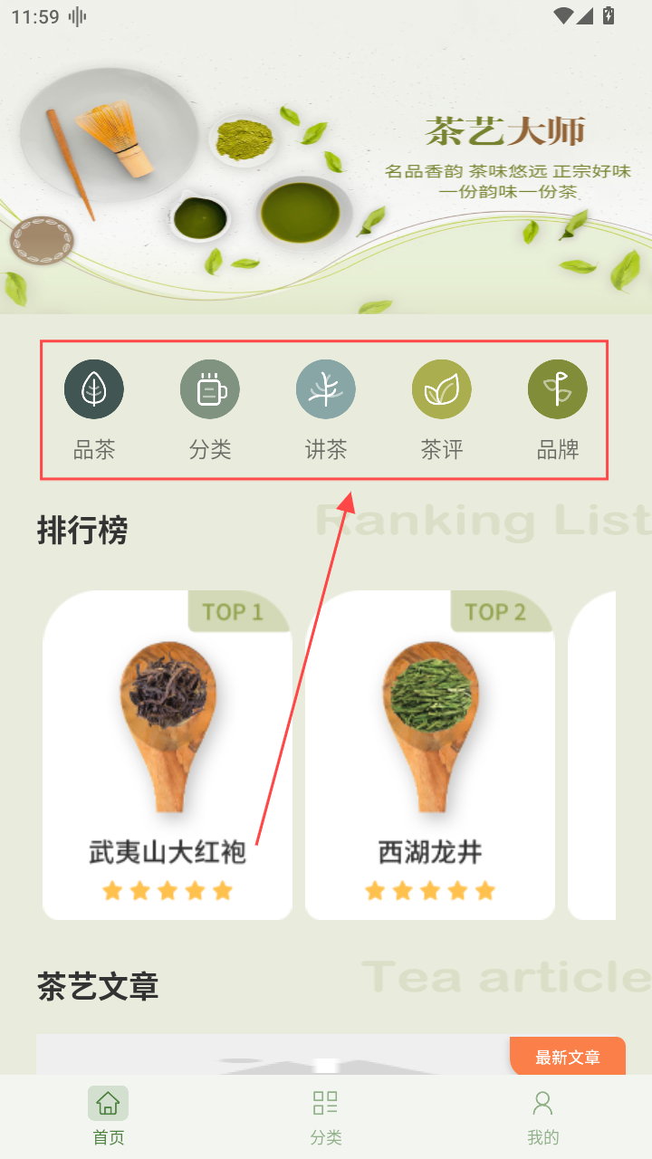 1、茶艺大师APP里面有品茶、分类、讲茶、评茶等功能。